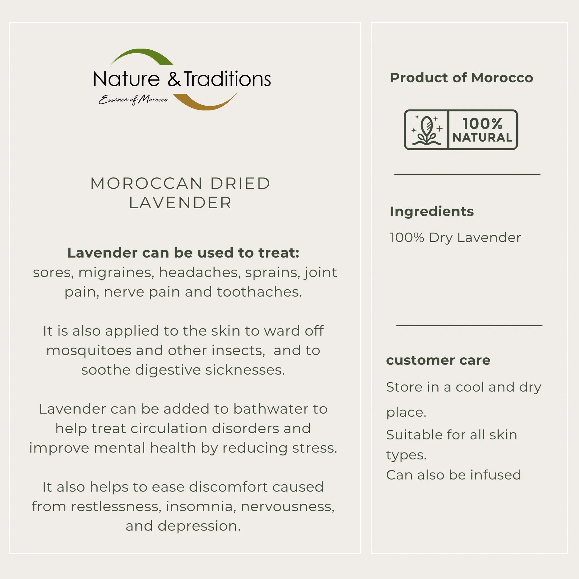 At Nature & Traditions, we source only the finest organic lavender grown in the pristine fields of Morocco. Free from harmful chemicals, this 100% natural herb provides a safe and eco-friendly way to support your health, relaxation, and beauty routine.